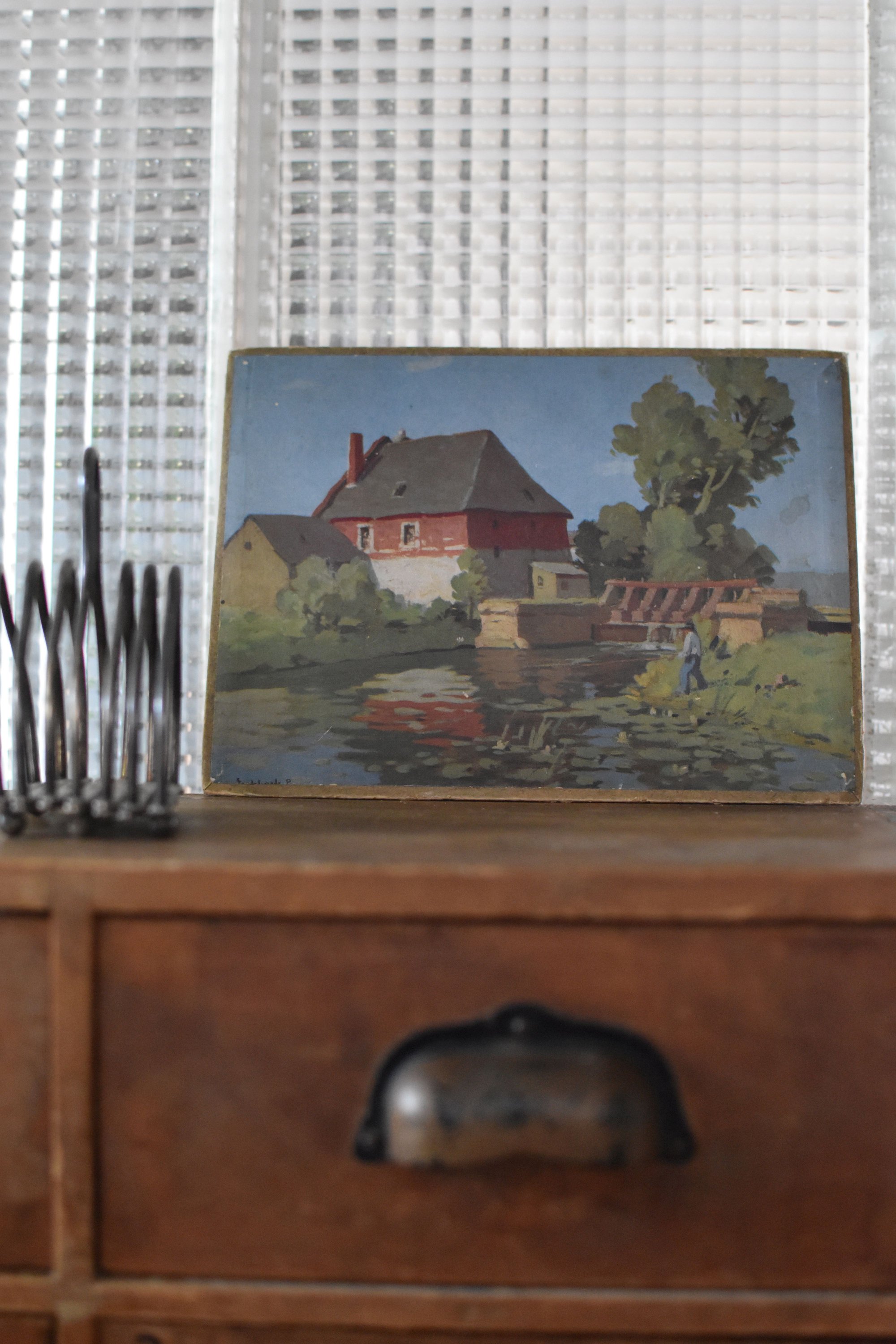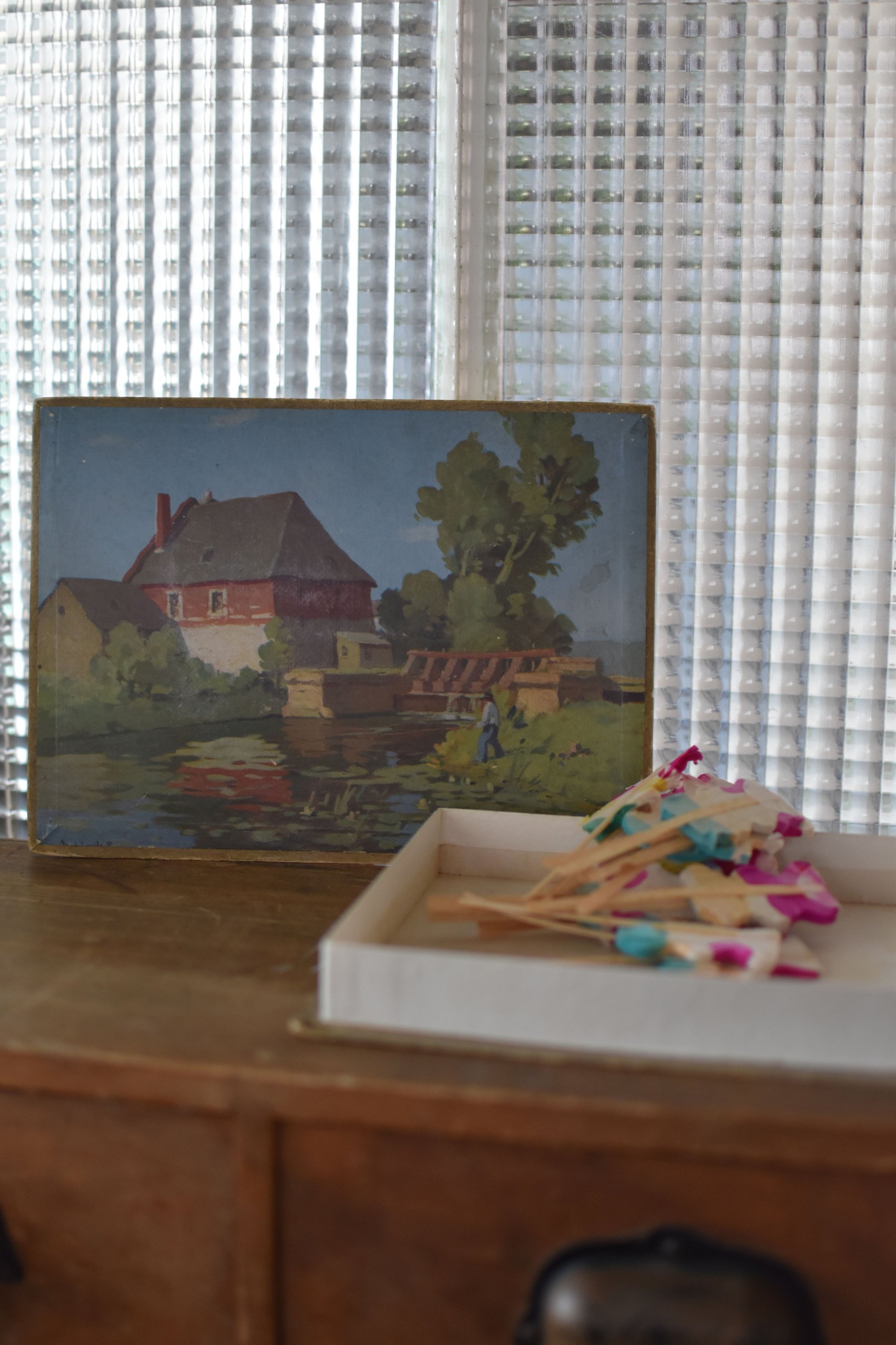 carton ancien au décor d'une maison à écluses Charmante, décorative, elle est en très bel état soulignée de bords dorés