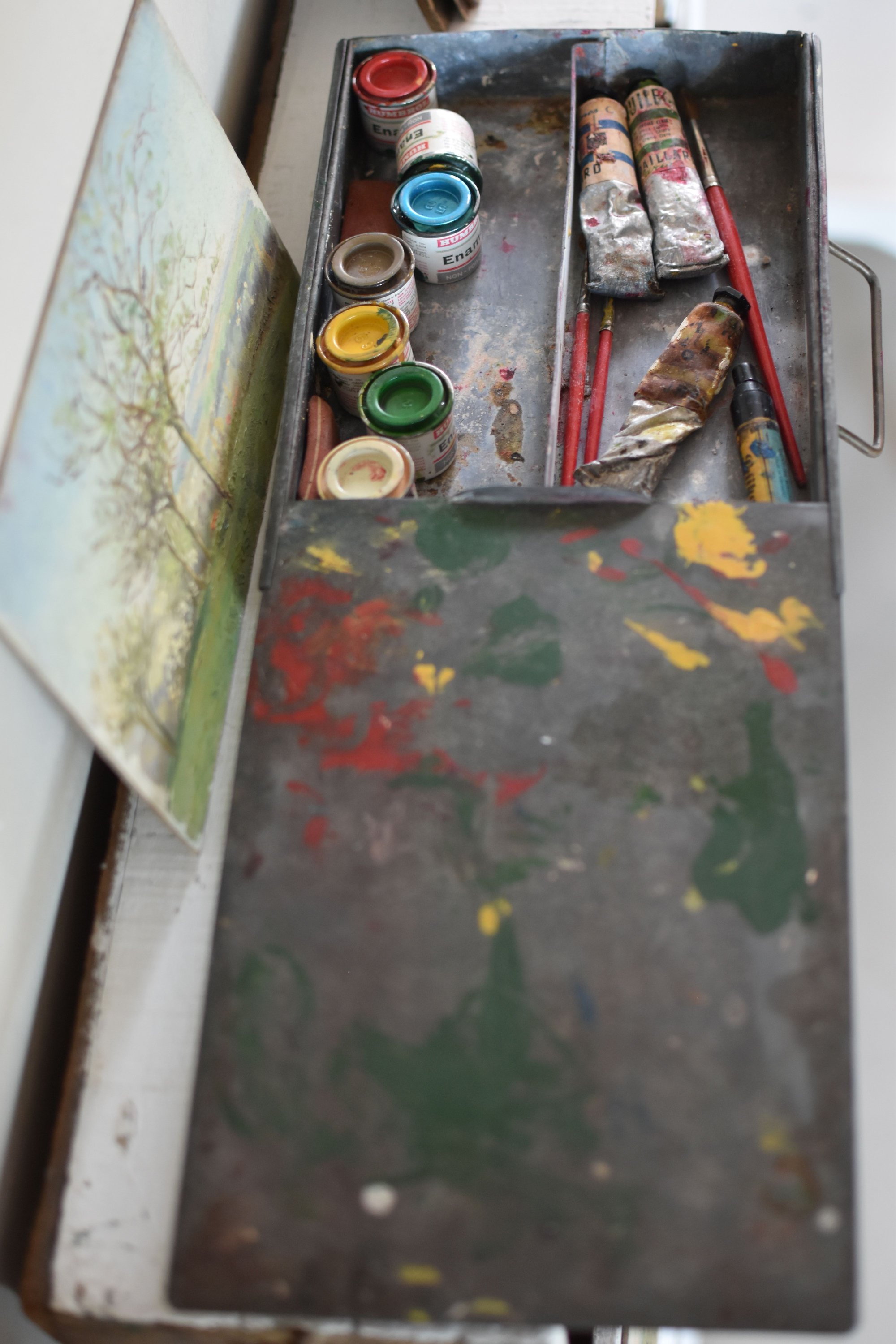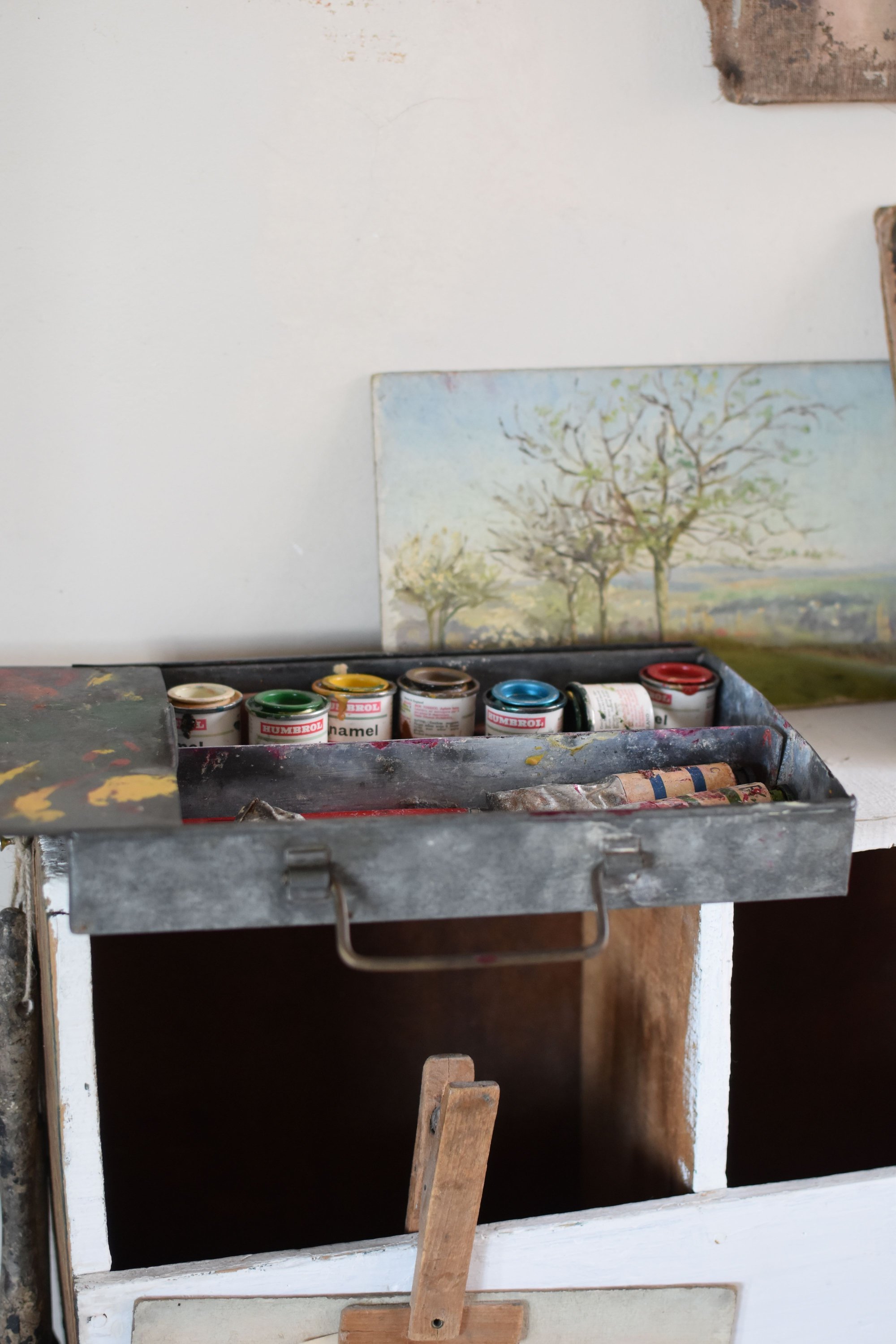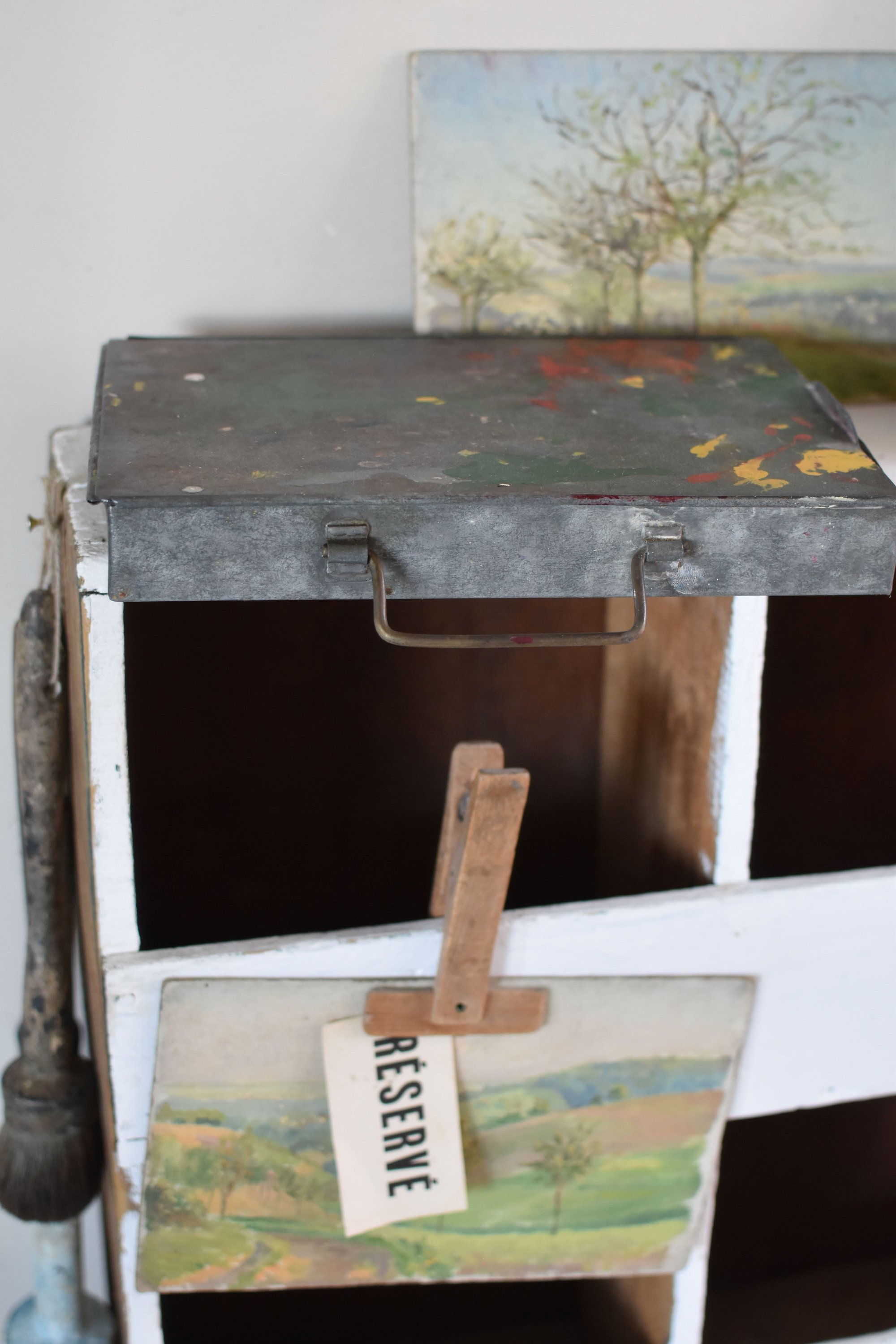 En zinc couvercle coulissant poignée en en façade entièrement d'origine vendu avec les restes de tubes et petits pots de peinture