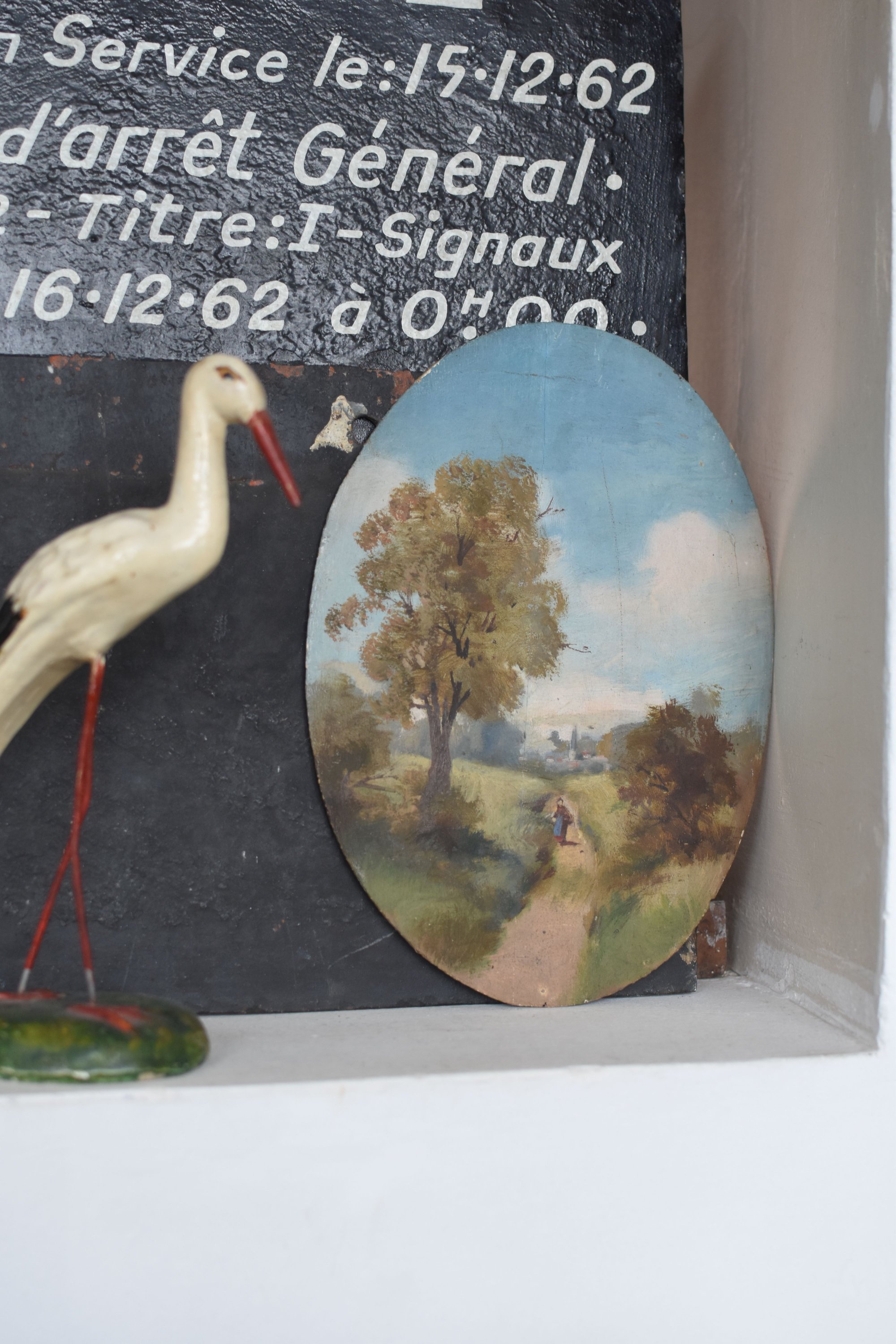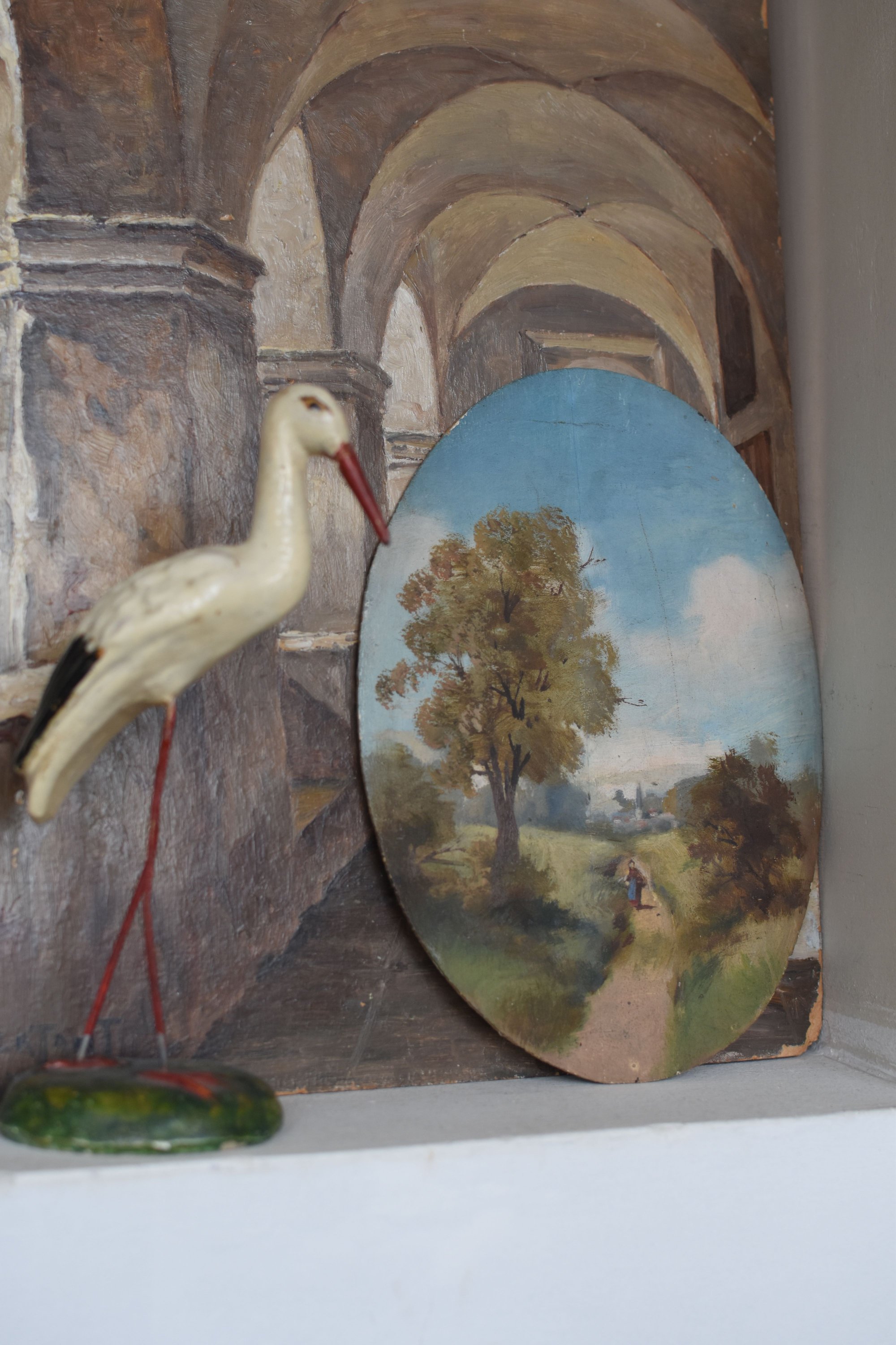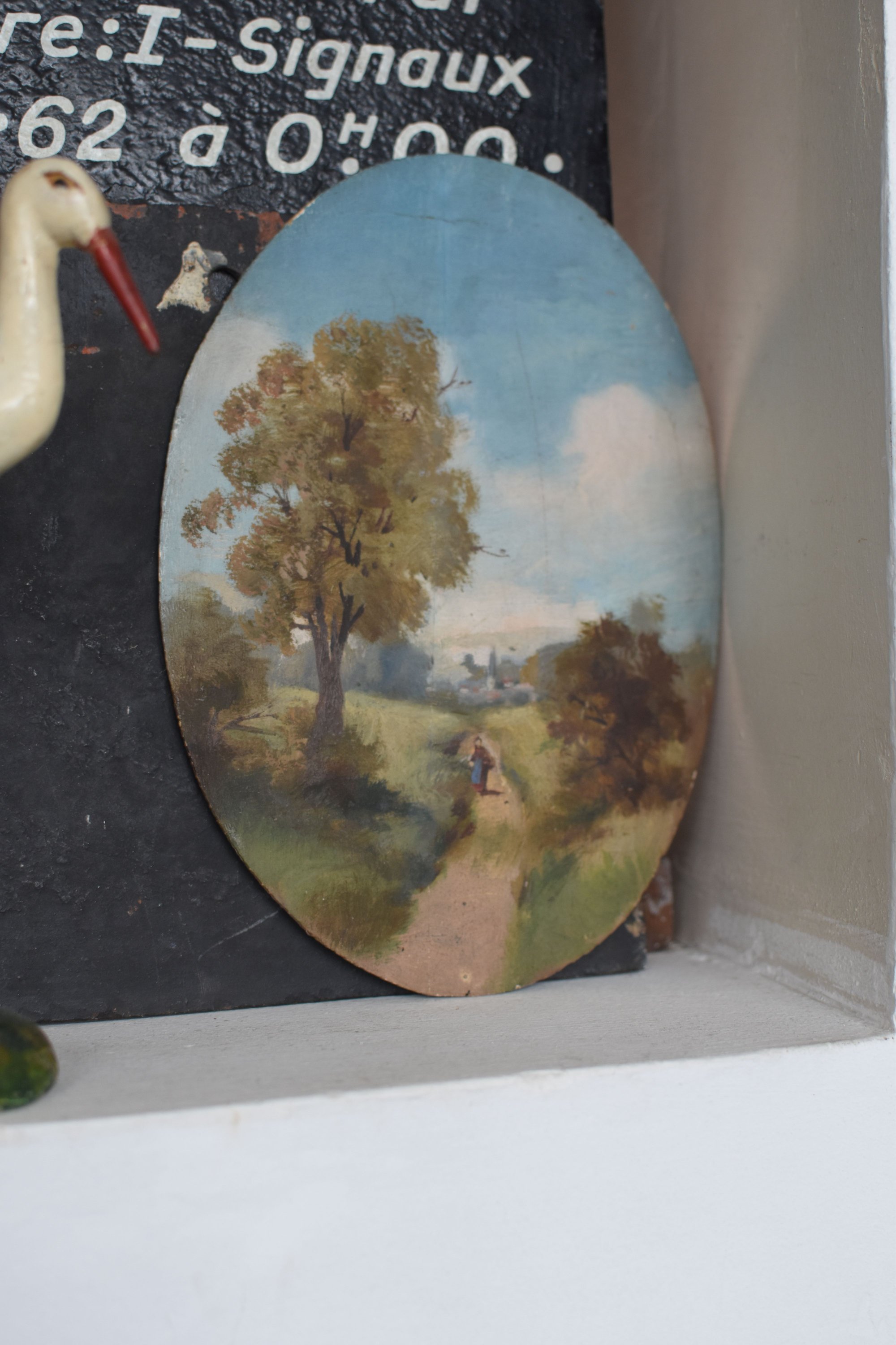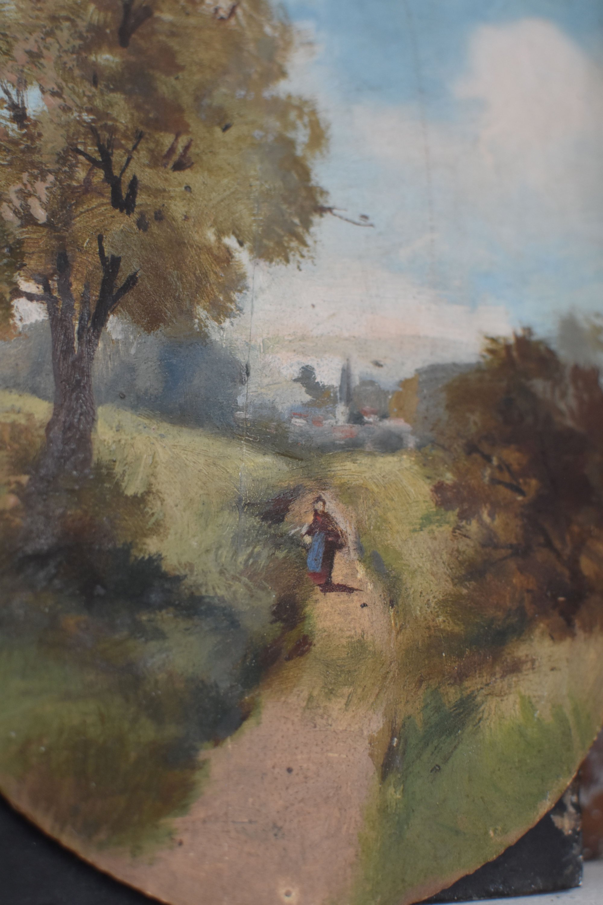 Ancienne peinture à l'huile sur médaillon bois représentant une campagne un clocher village en arrière plan et une paysanne avec paniers sur un chemin