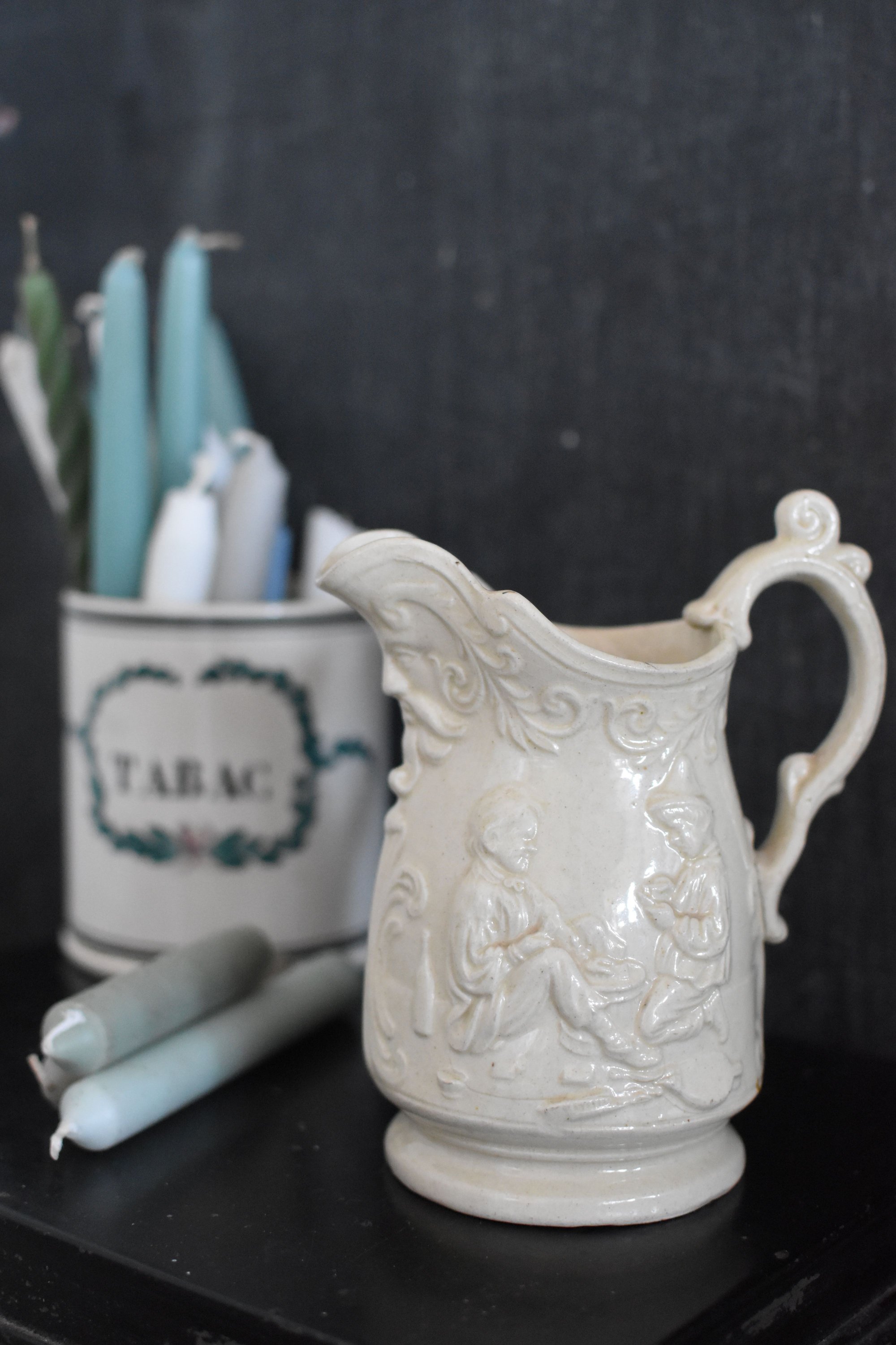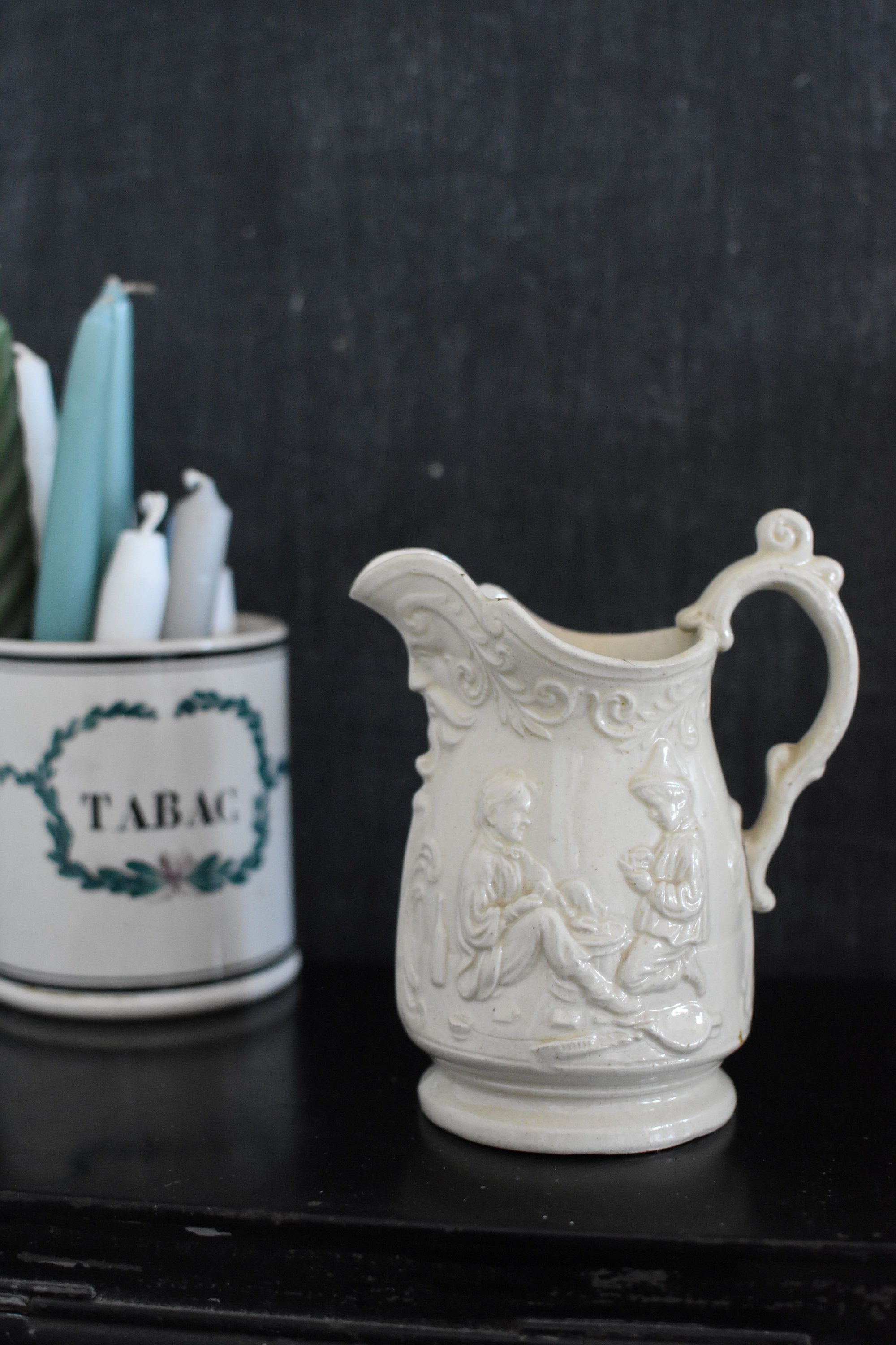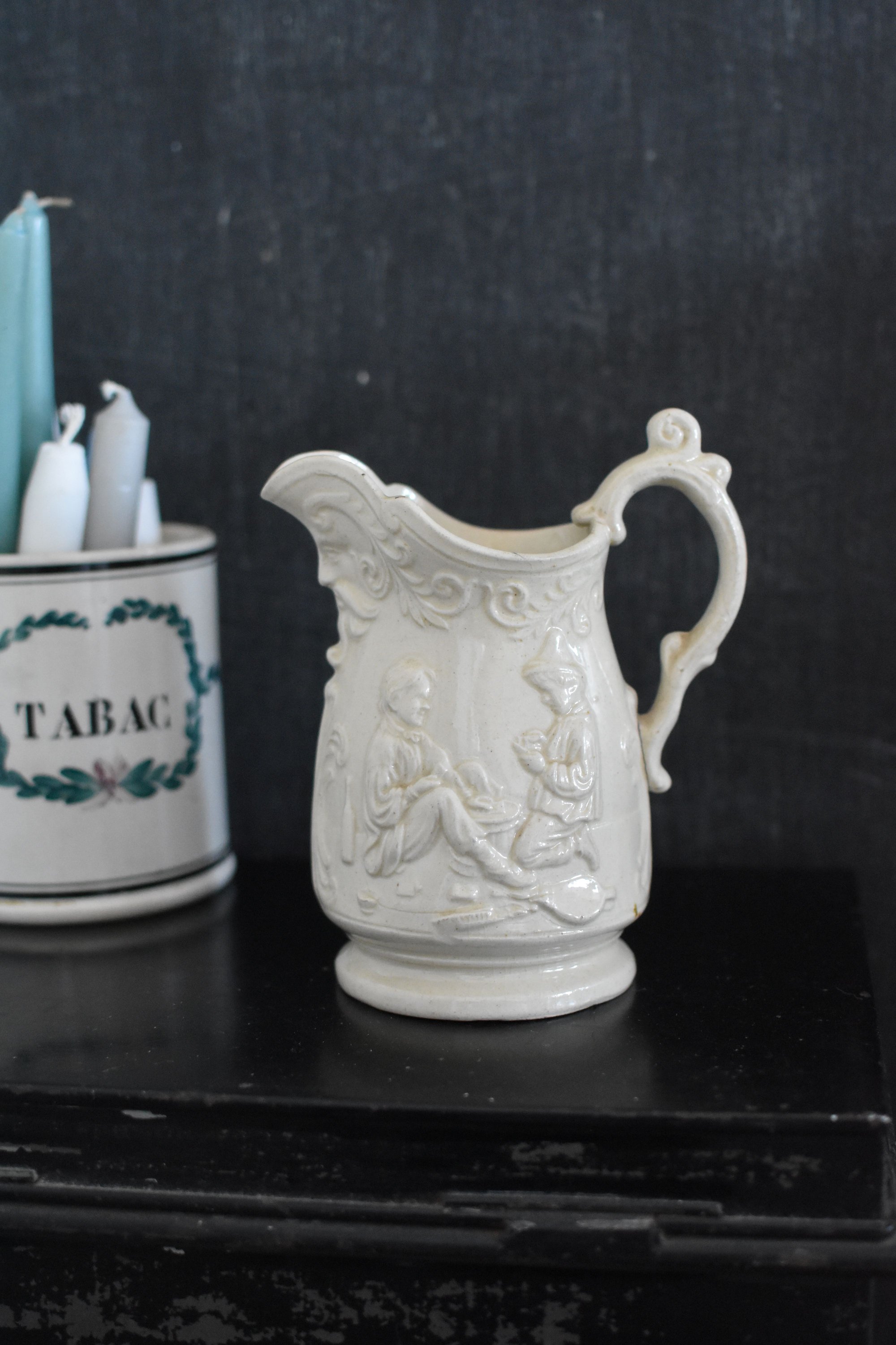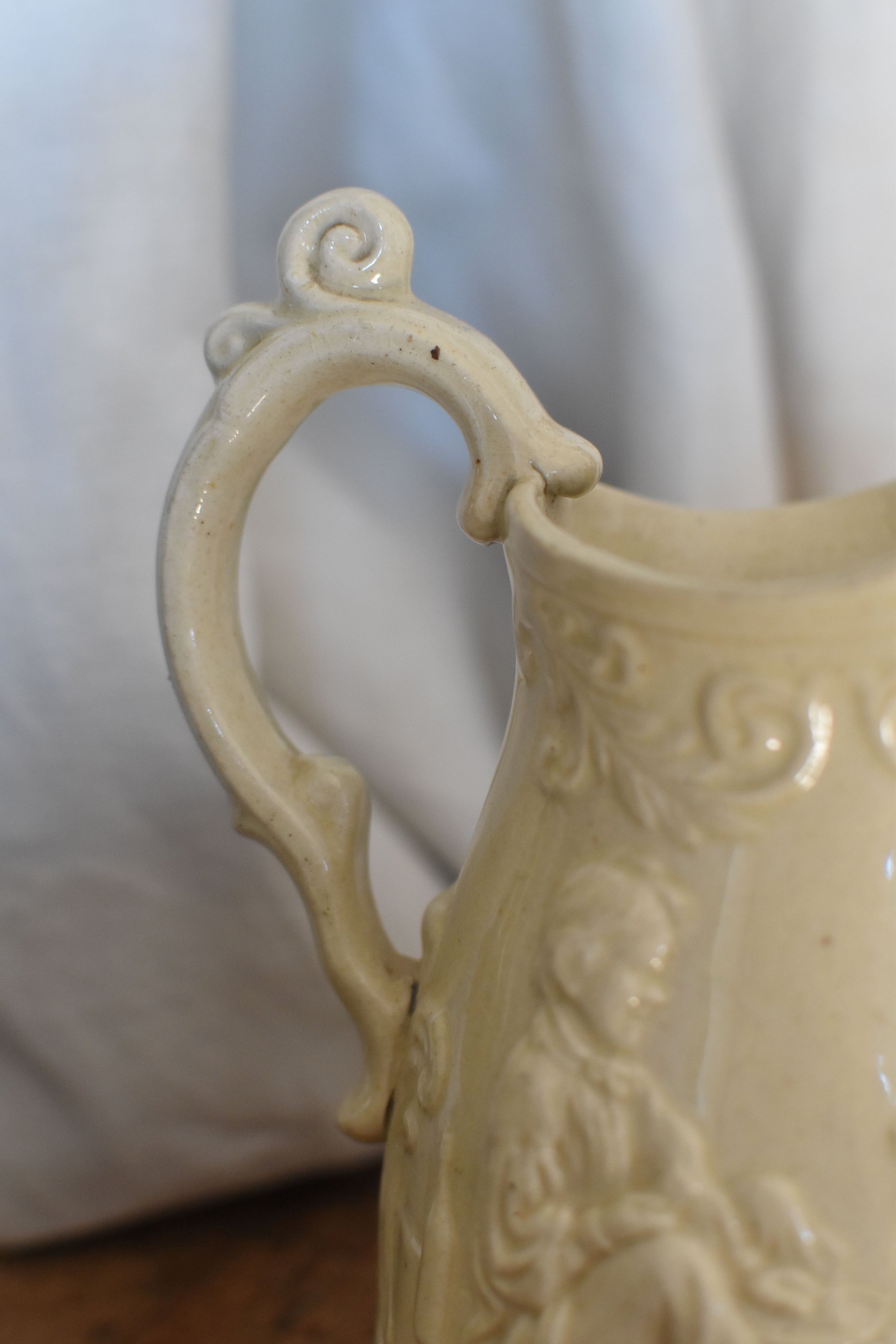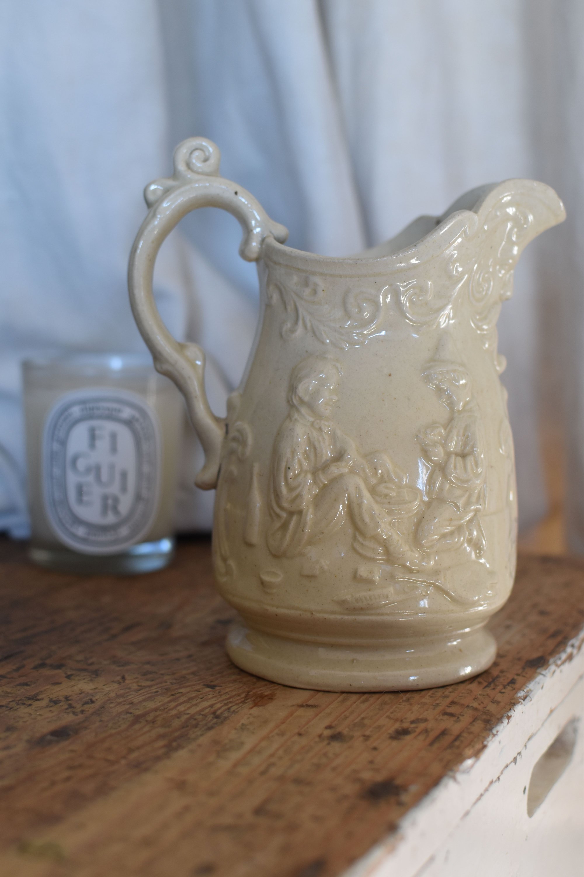 Très belle facture pour ce pichet vernis couleur naturelle personnages motifs en relief